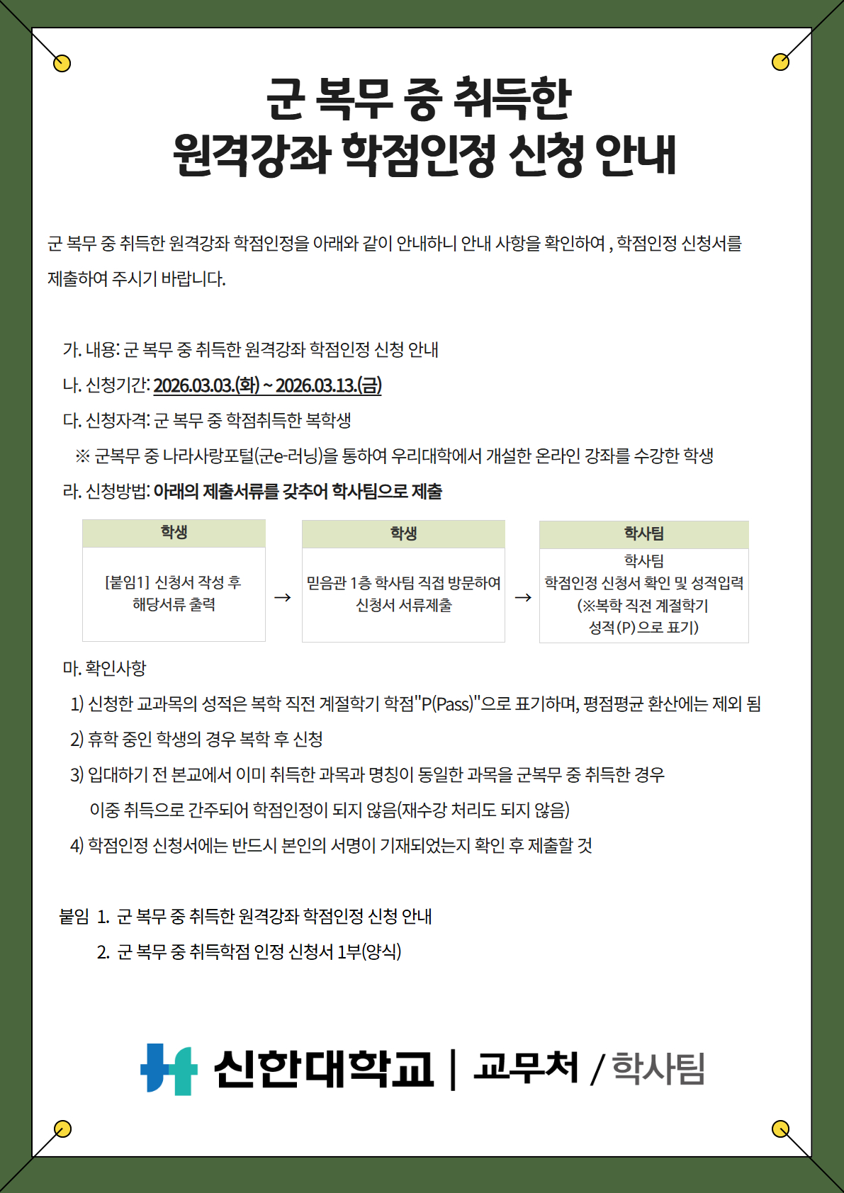 [학사팀/성적] 군 복무 중 취득한 원격강좌 학점인정 안내